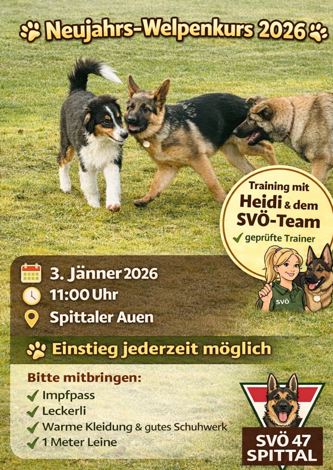 Es werden auch Anmeldungen per E-Mail: Kontakt (info@hundeschule-spittal.at) oder per Telefon 0660 5878947 entgegengenommen.